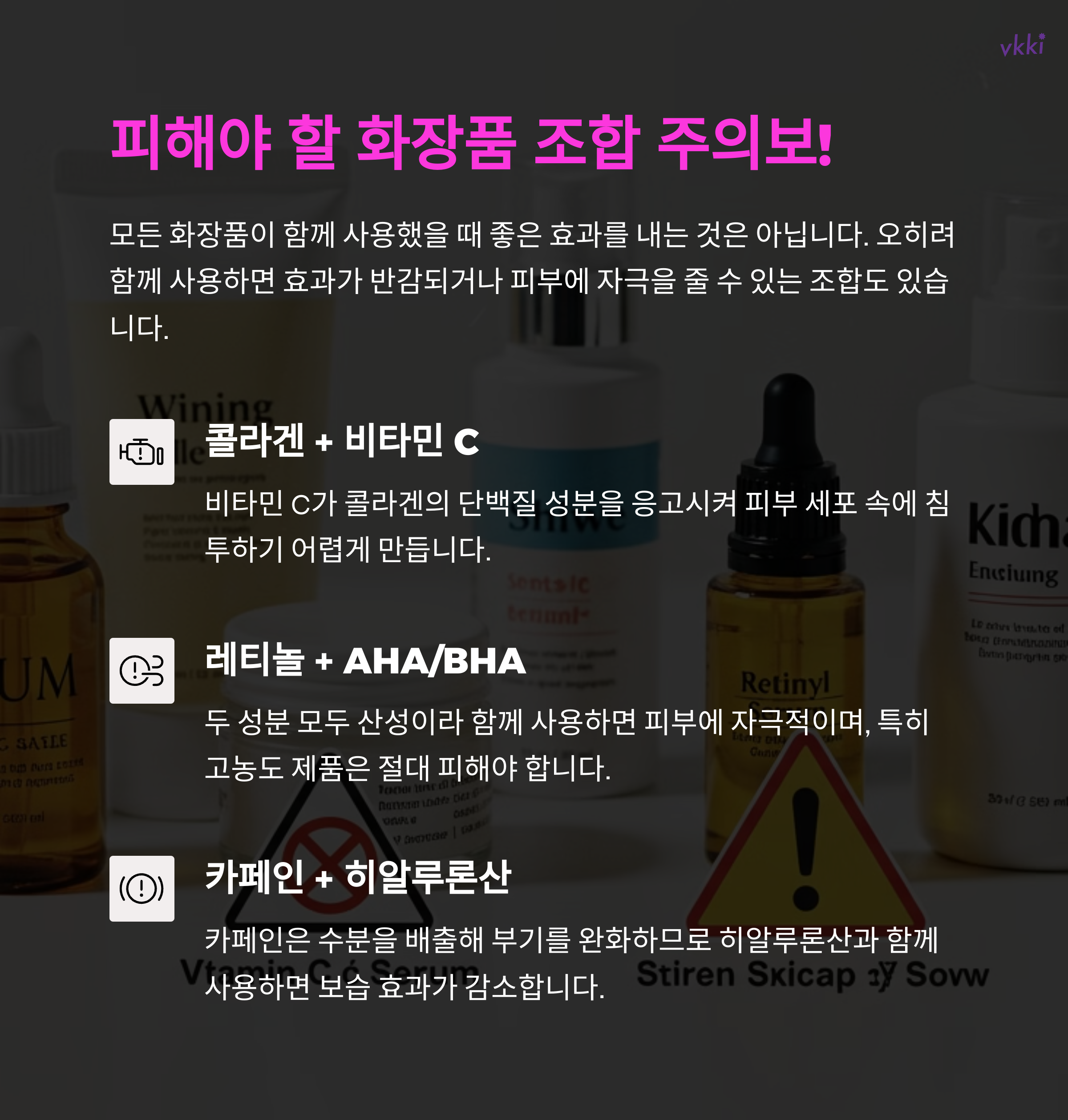 모든 화장품이 함께 사용했을 때 좋은 효과를 내는 것은 아니에요. 오히려 함께 사용하면 효과가 반감되거나 피부에 자극을 줄 수 있는 조합도 있습니다.