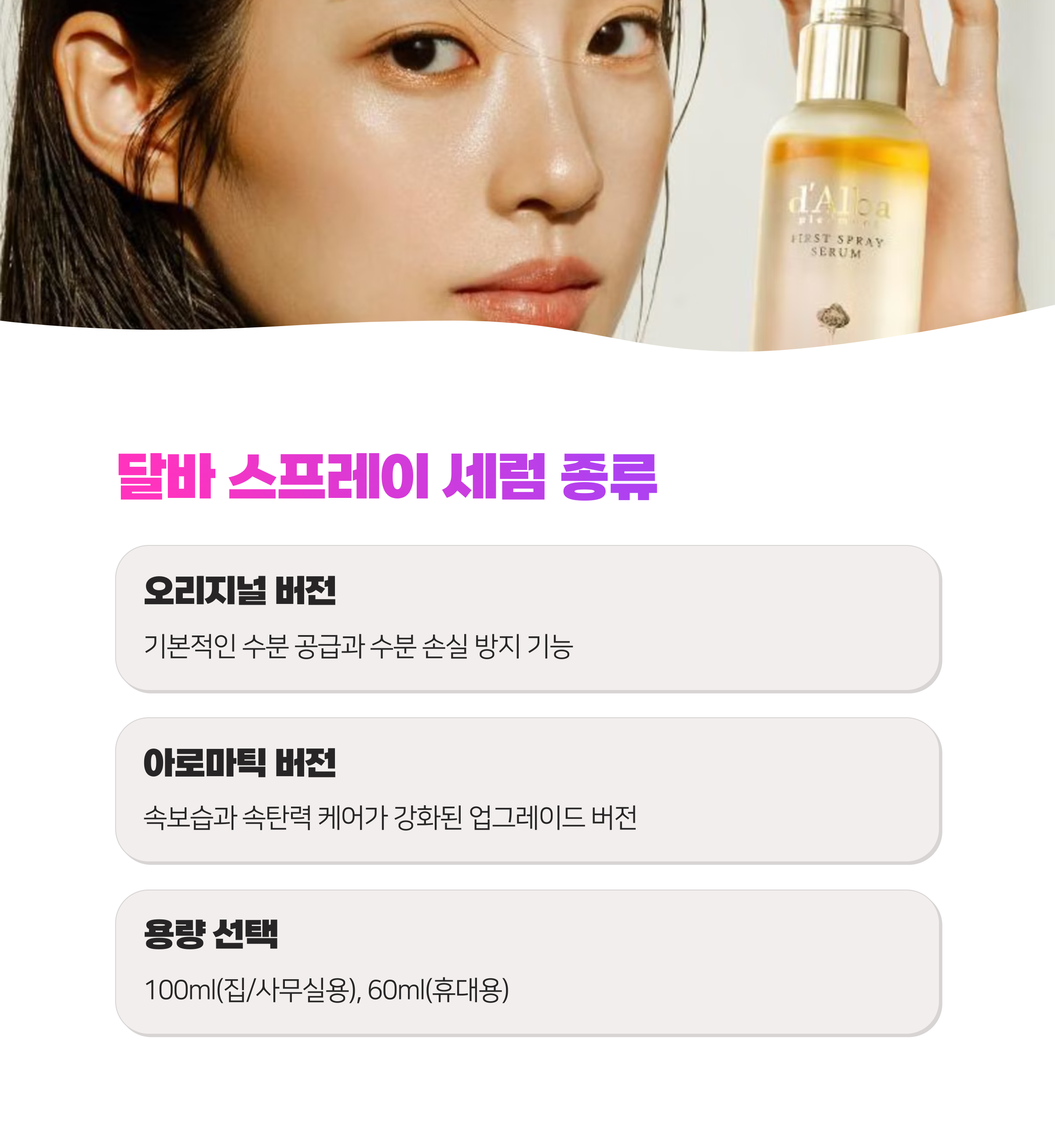 많은 분들이 뿌리는 미스트형 세럼은 효과가 떨어지지 않을까? 하는 걱정을 하시는데요, 달바 퍼스트 스프레이 세럼은 그런 걱정을 싹 없애주는 제품이에요!
