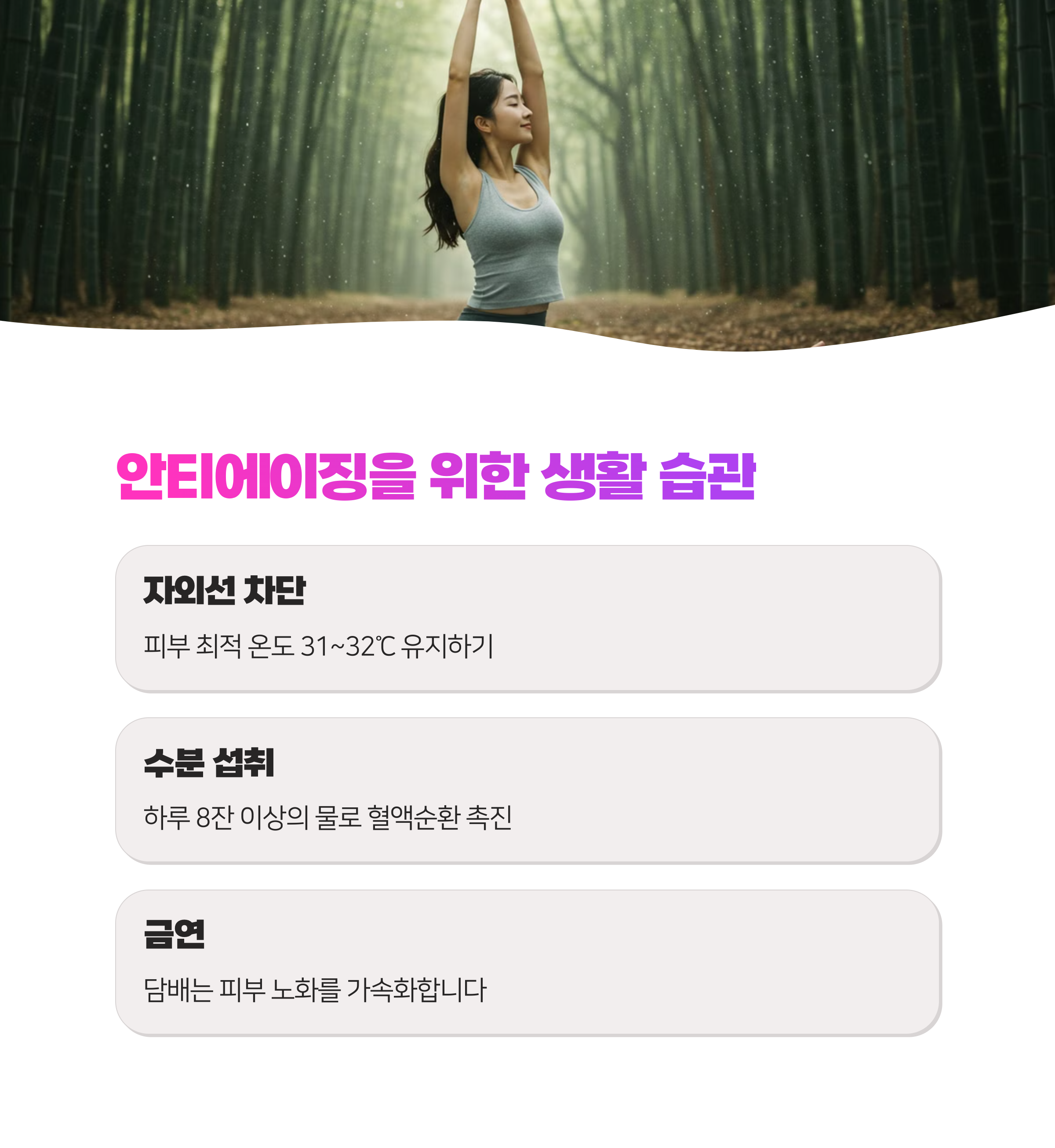 더불어 피부 온도 관리도 중요해요. 우리 몸의 정상 체온은 36.5℃지만 피부의 최적 온도는 31~32℃랍니다. 피부 온도가 너무 높으면 진피 세포가 손상되는 '열노화'가 발생할 수 있어요.