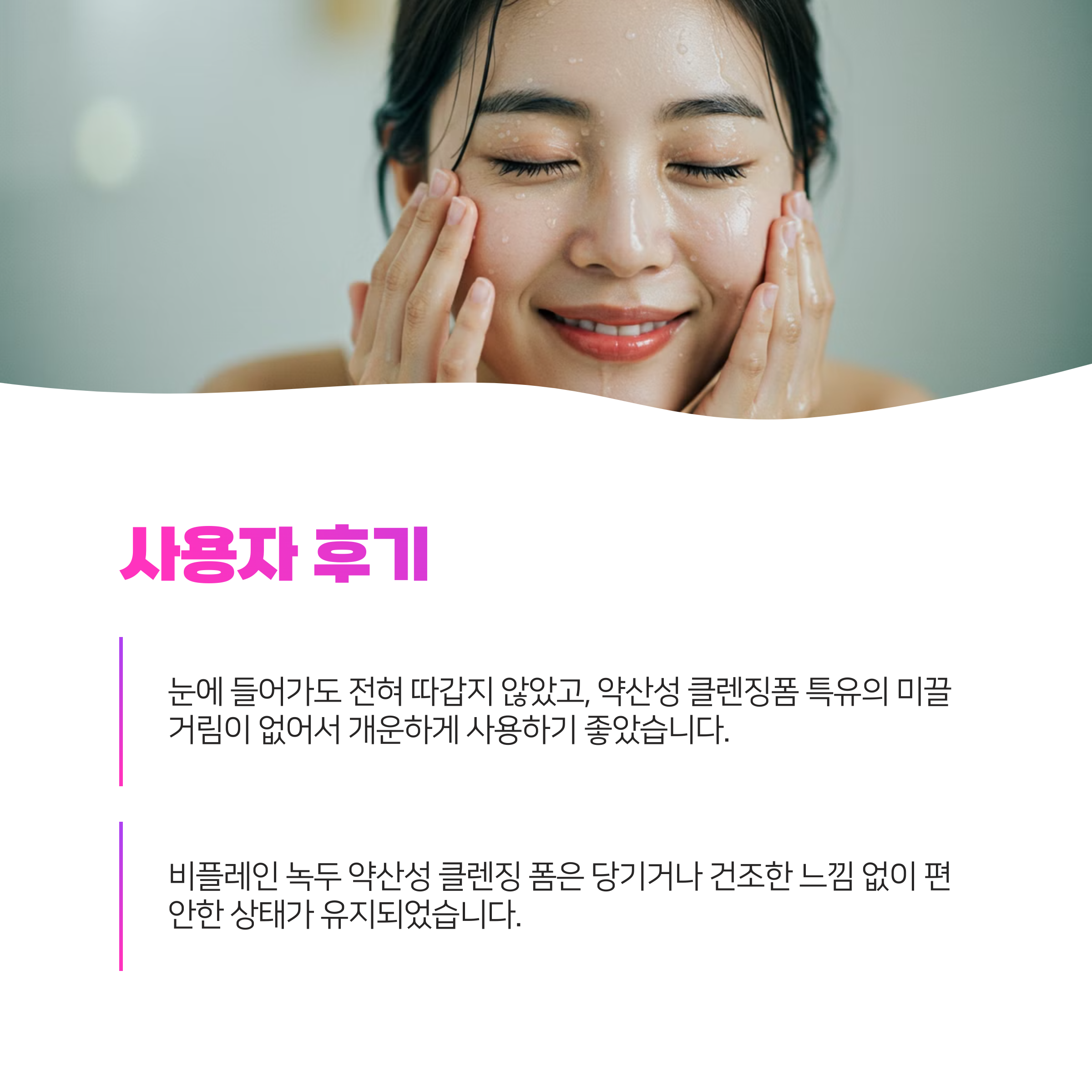 - “눈에 들어가도 따갑지 않고 거품도 순해서 매일 쓰기 좋아요!”