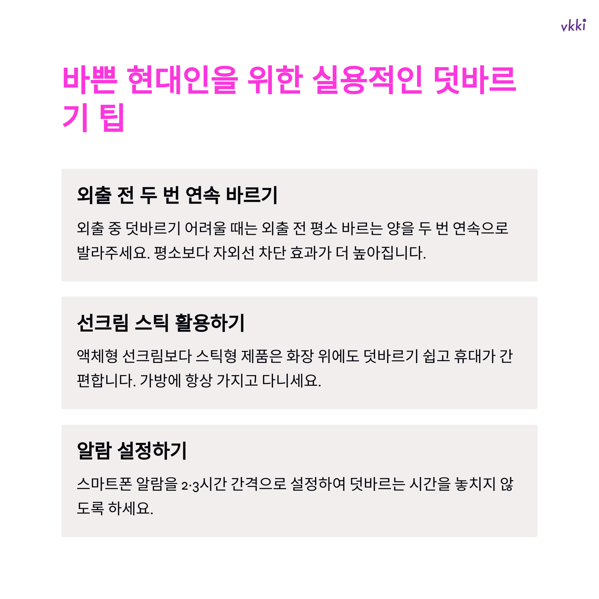 선크림의 올바른 사용법과 덧바르는 타이밍에 대해 알아보세요. 효과적인 자외선 차단을 위해서는 적절한 양을 사용하고, 2-3시간마다 덧발라주는 것이 중요합니다. 외출 20분 전 바르기, 2단계 덧바르기 등 현실적인 선크림 사용법과 주의사항까지 자세히 알려드립니다.