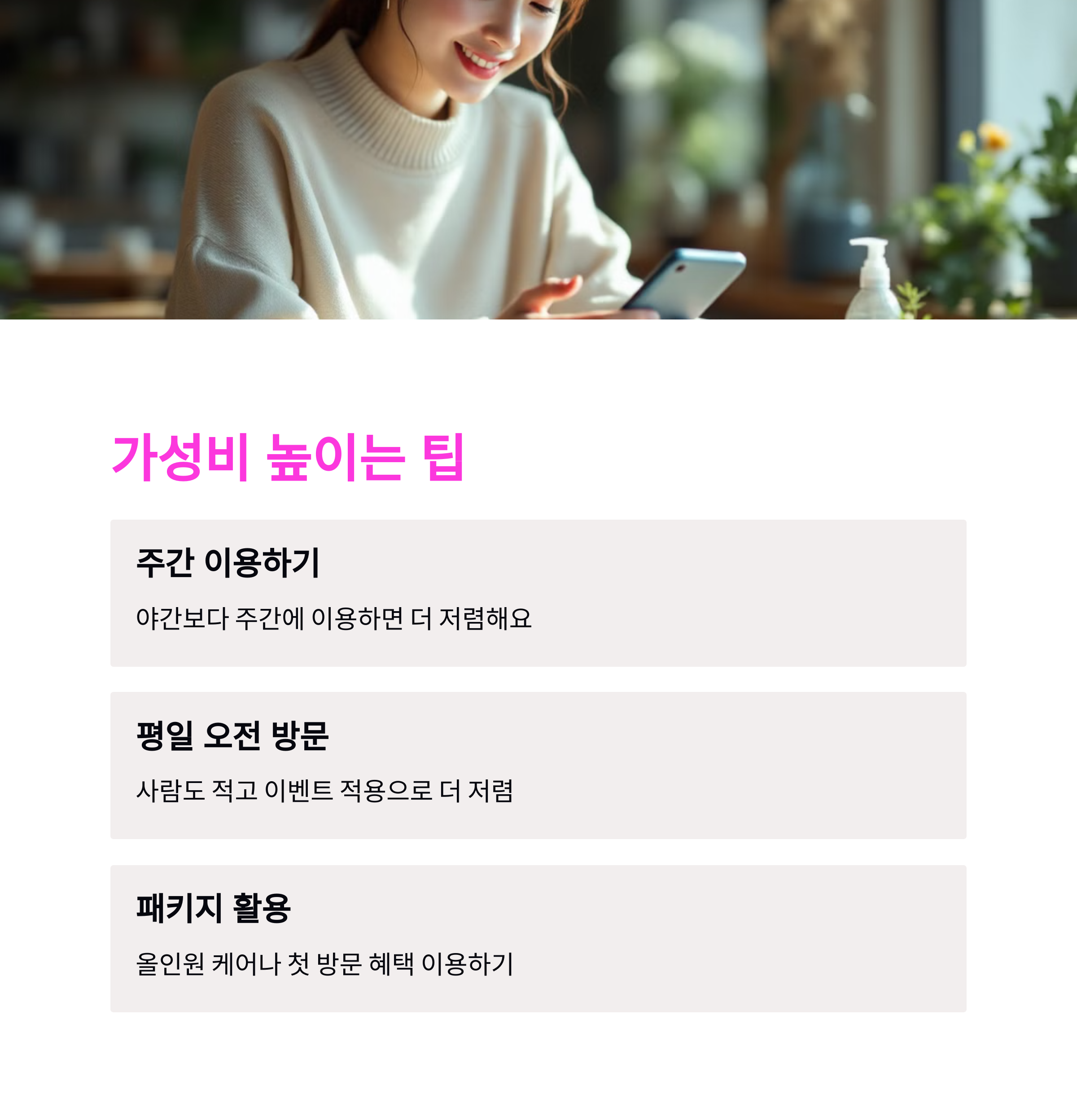 - 다양한 프로그램: 페이스 케어, 아로마 오일 케어, 올인원 코스