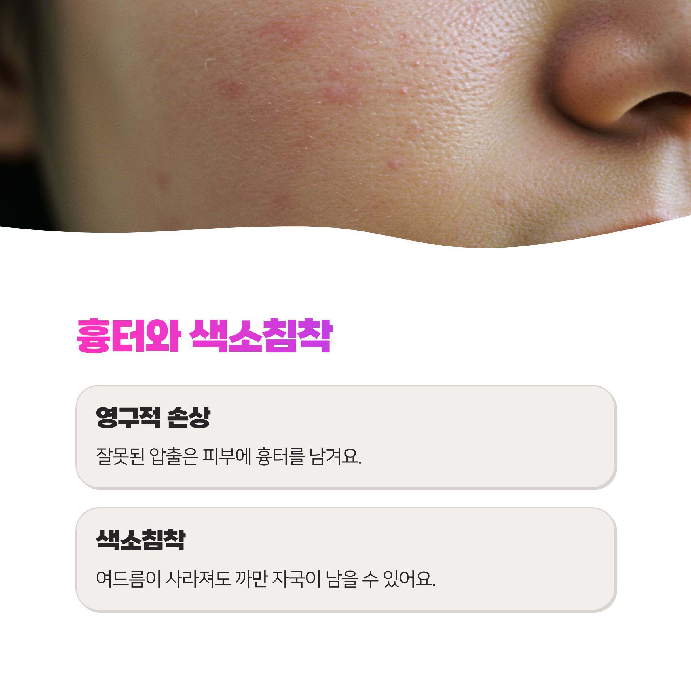잘못된 압출은 피부를 심각하게 손상시켜 흉터나 색소침착을 남길 수 있어요. 여드름이 사라져도 그 자리에 까만 자국이나 패인 흉터가 남는다면 더 오래 고생하게 될 거예요ㅠㅠ