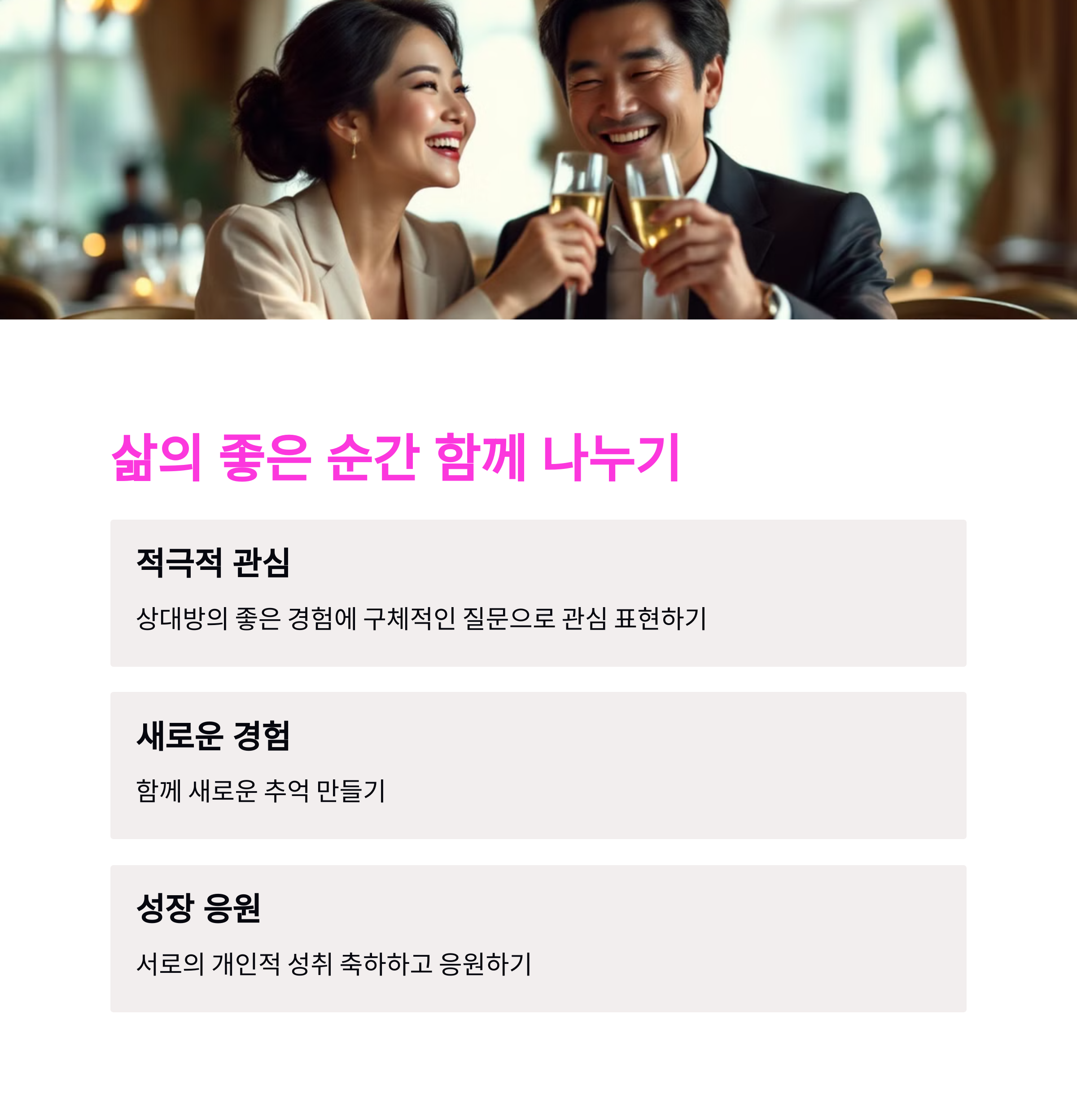 - 상대방의 삶에서 좋은 경험, 좋은 순간을 공유하고 적극적으로 관심을 가지세요