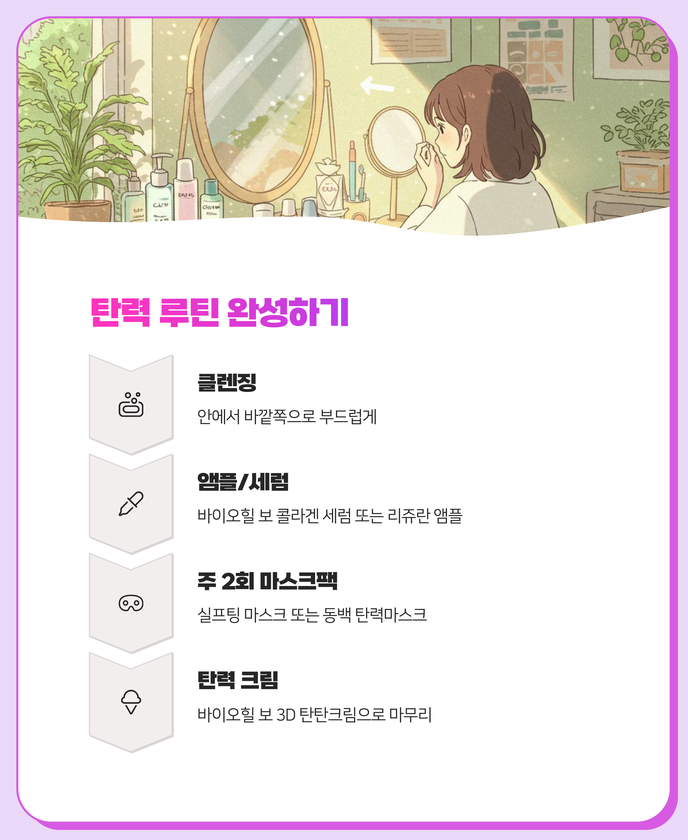 - 클렌징 → 앰플/세럼 → 마스크팩 → 크림으로 탄력 루틴 완성!