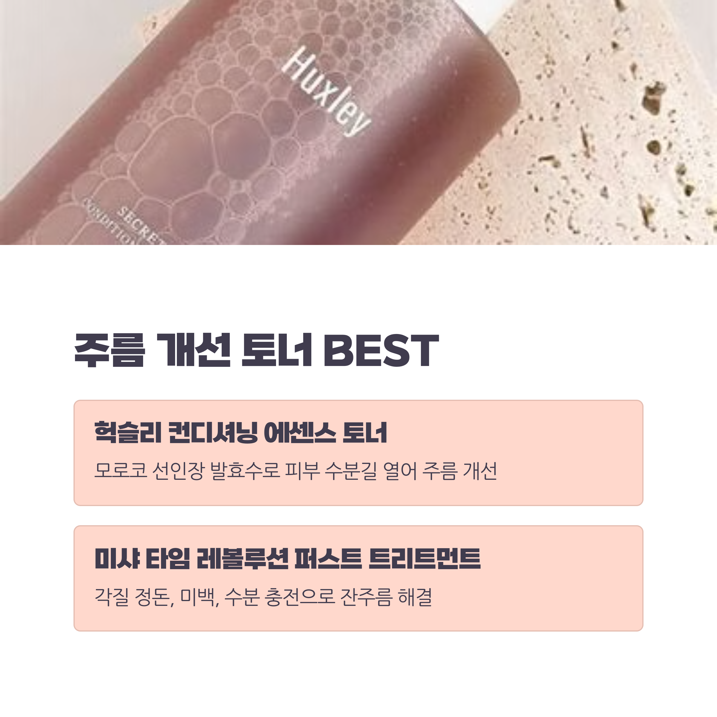 • 건성 + 주름 고민: 미샤 타임 레볼루션 퍼스트 트리트먼트 에센스, 헉슬리 컨디셔닝 에센스 토너