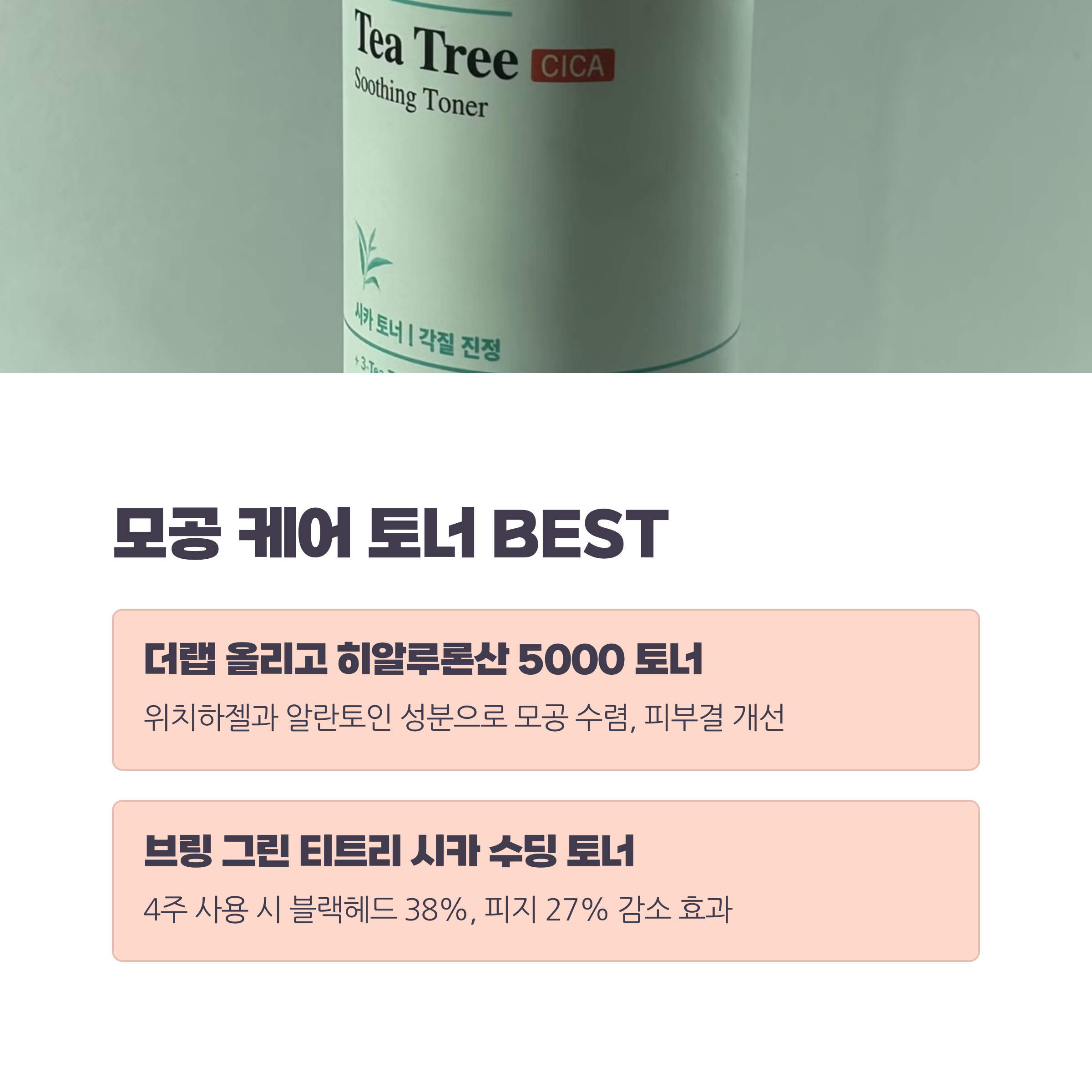 - 지성 + 모공 고민: 브링 그린 티트리 시카 수딩 토너, 더랩 올리고 히알루론산 5000 토너