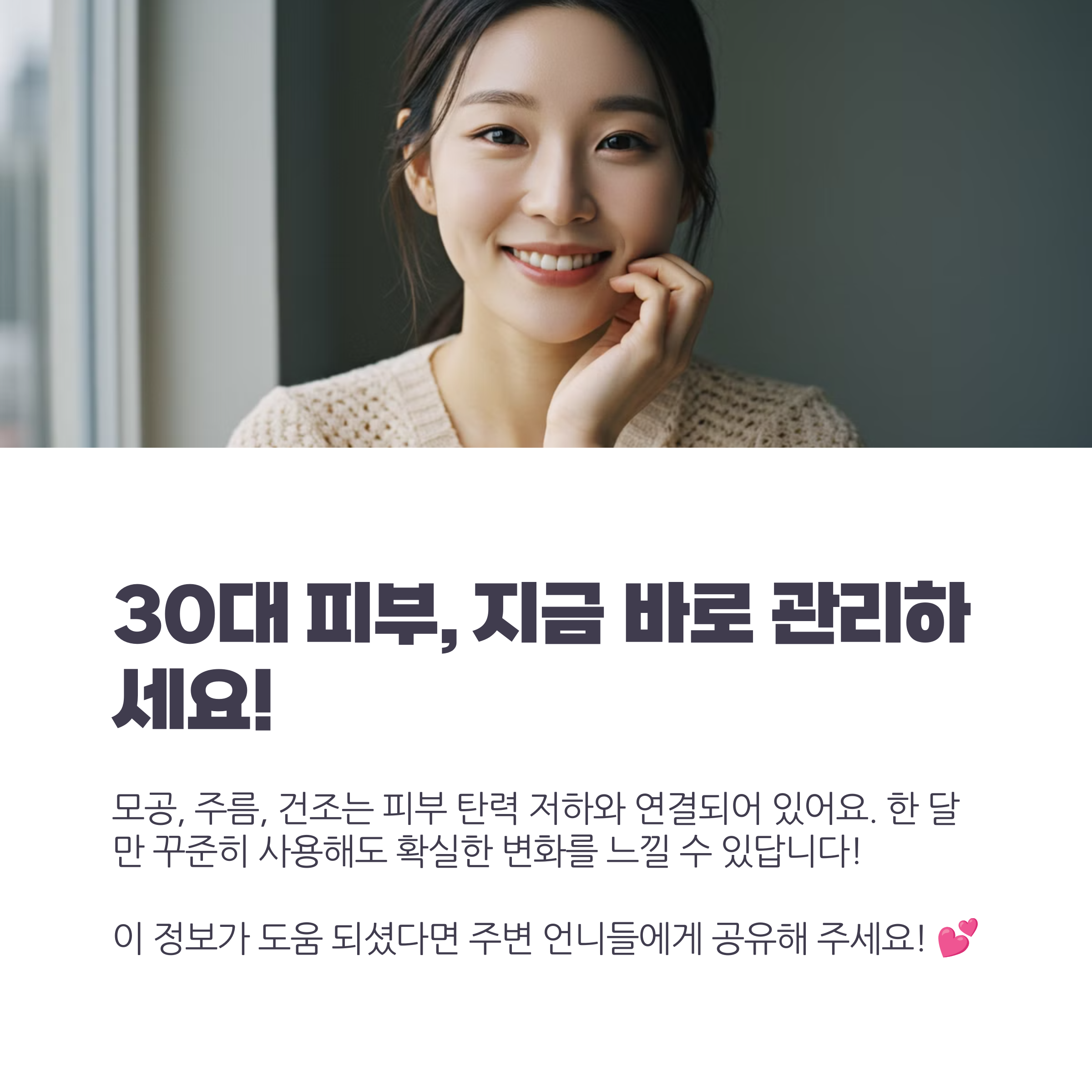 30대 피부 관리의 핵심은 바로 피부 변화에 맞춰 올바른 제품을 선택하는 것이에요. 모공, 주름, 건조 문제는 결국 피부 탄력 저하와 연결되어 있기 때문에 종합적인 관리가 필요합니다.