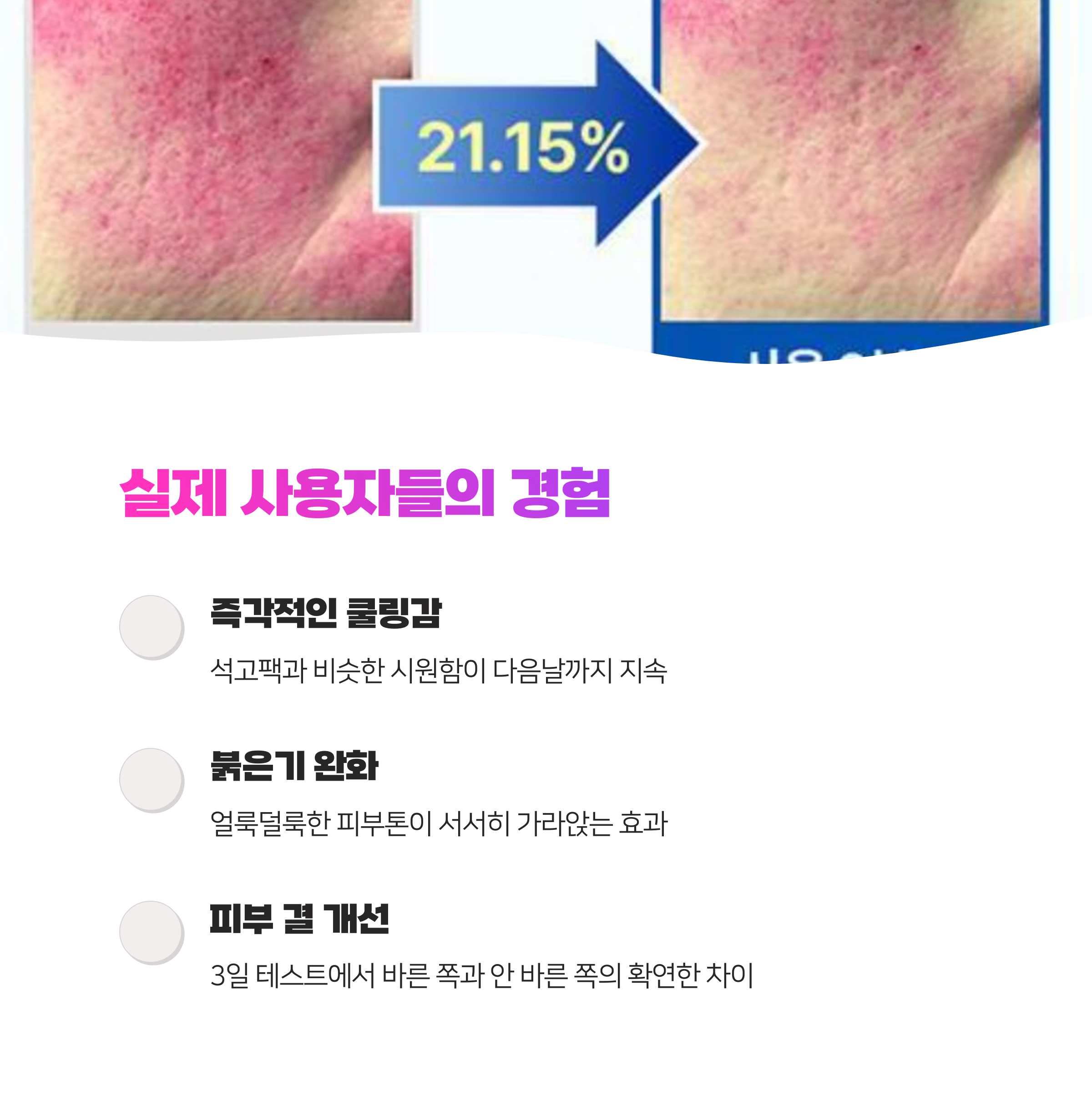 “차가운 쿨링감이 석고팩 같아요” “바른 날과 안 바른 날 피부 컨디션이 확연히 달라요!” 붉은기 진정과 트러블 완화 효과가 눈에 띄었다는 후기가 많았어요.