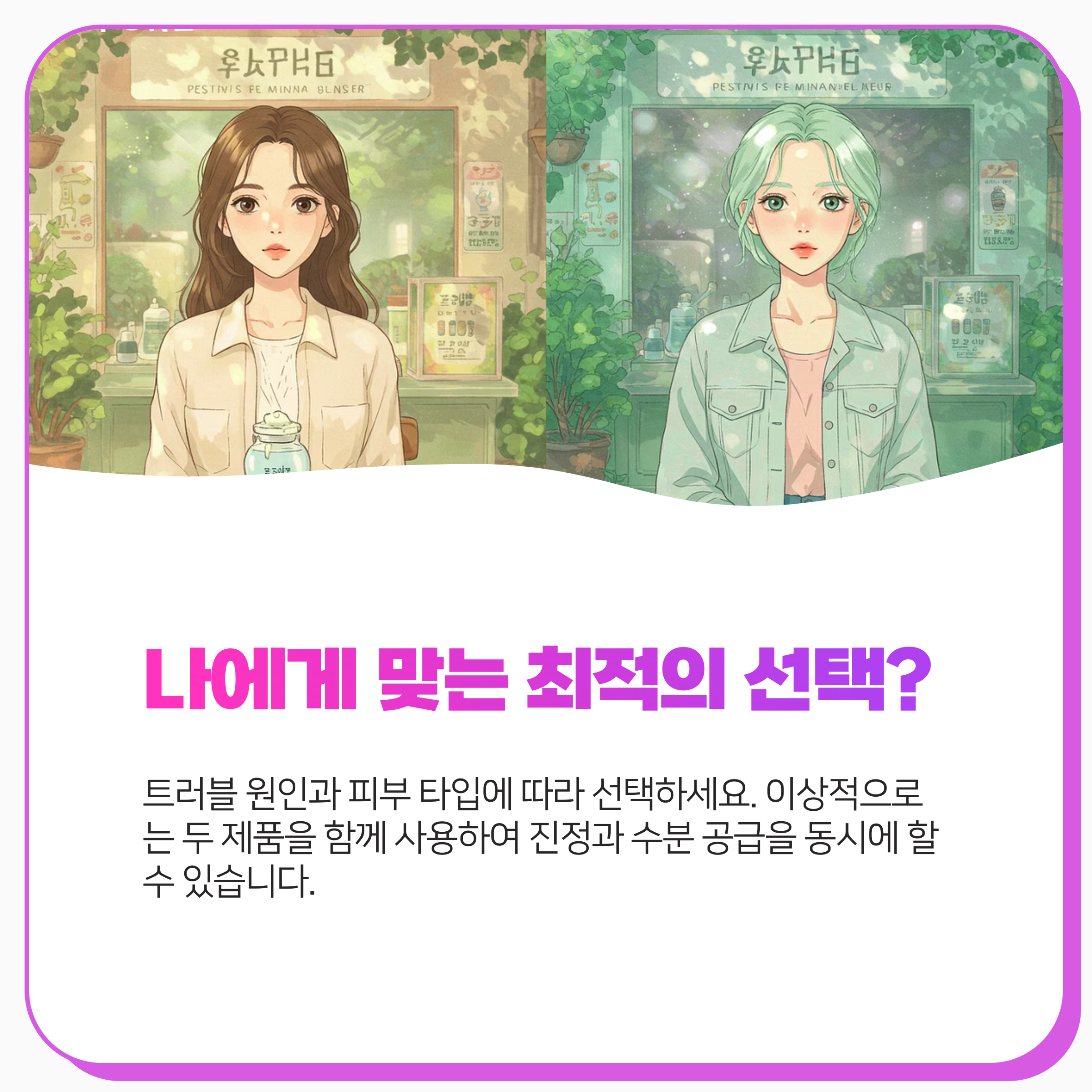 | 핵심 기능 | 트러블 진정 / 피지 조절 | 속보습 / 피부 진정 |