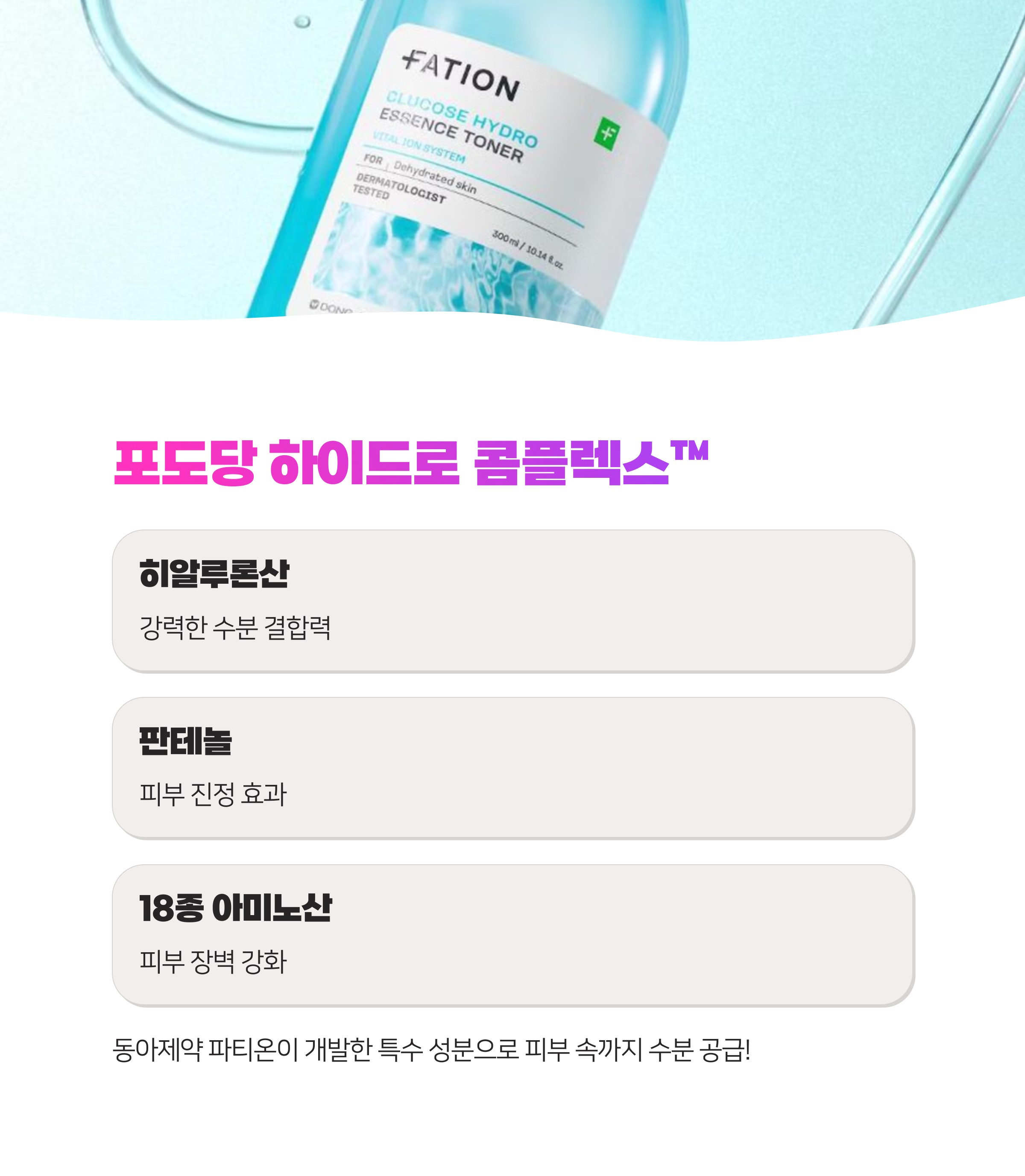 포도당 하이드로 콤플렉스™ : 히알루론산 + 판테놀 + 18종 아미노산을 결합해 수분 자석처럼 작용해요.