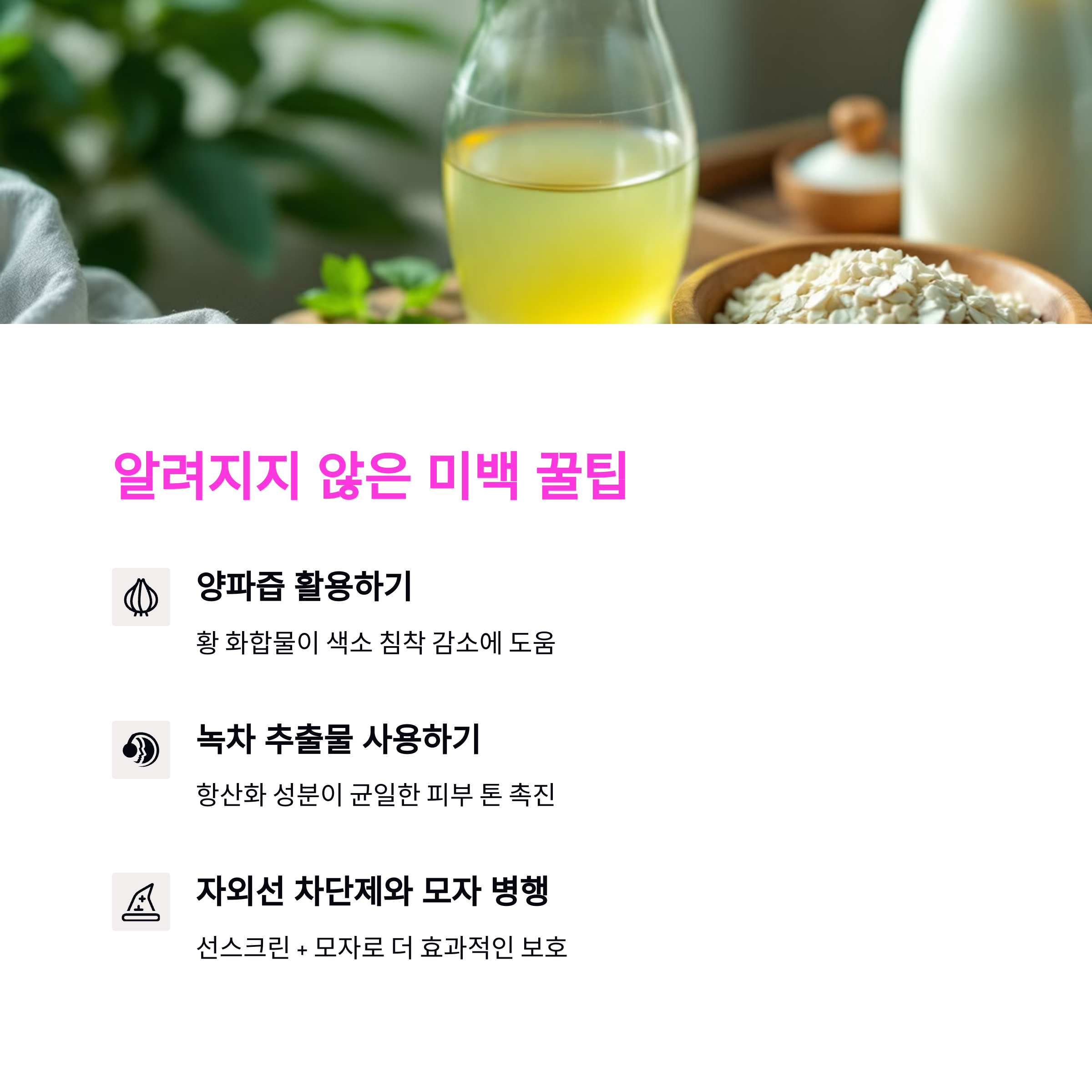 히알루론산이나 세라마이드가 함유된 가벼운 보습제를 사용하세요. 건강한 피부 장벽 유지는 미백에도 중요합니다.