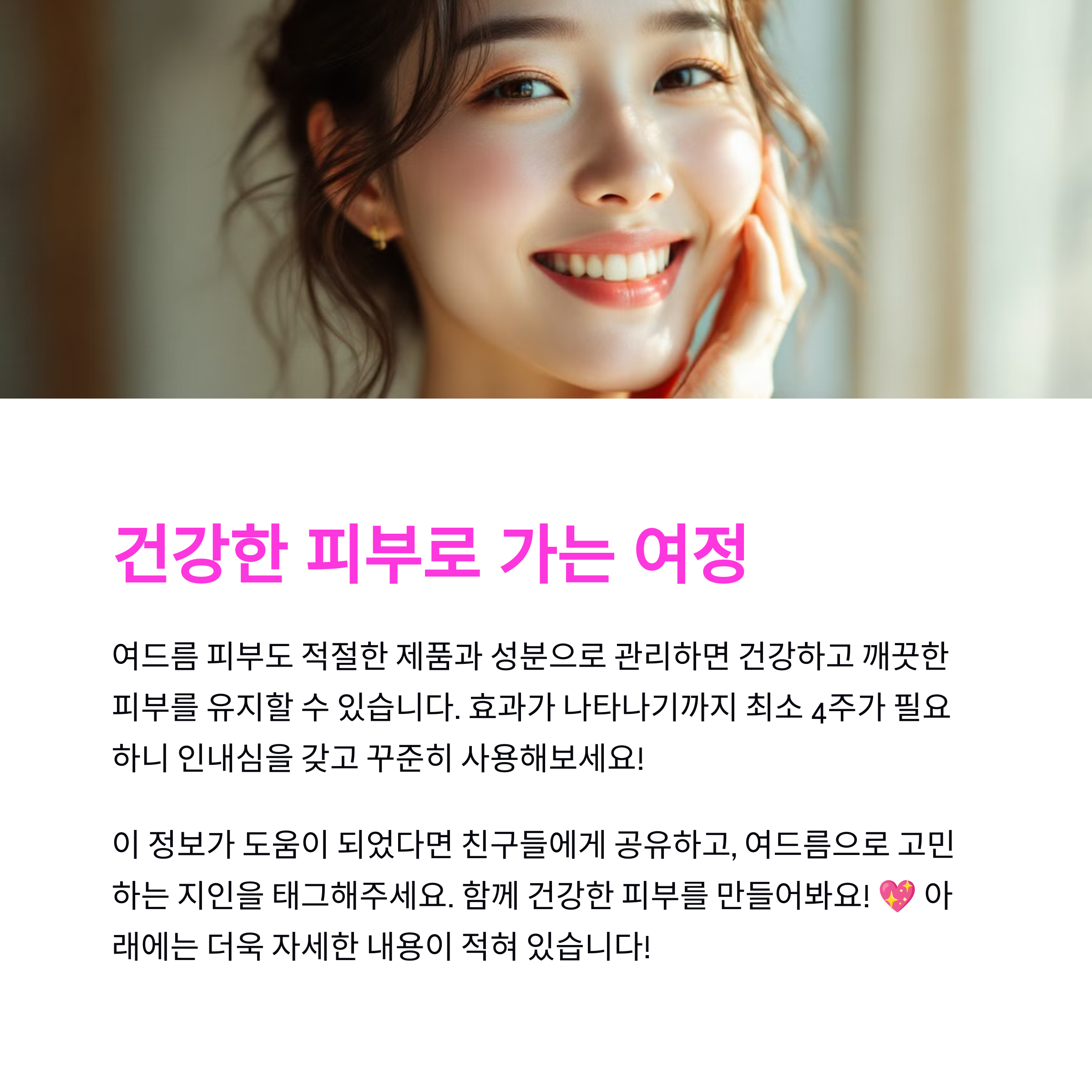 여드름 피부도 적절한 제품과 성분으로 관리하면 건강하고 깨끗한 피부를 유지할 수 있어요. 자신의 피부 타입에 맞는 제품을 선택하고 꾸준히 사용해보세요! 😊