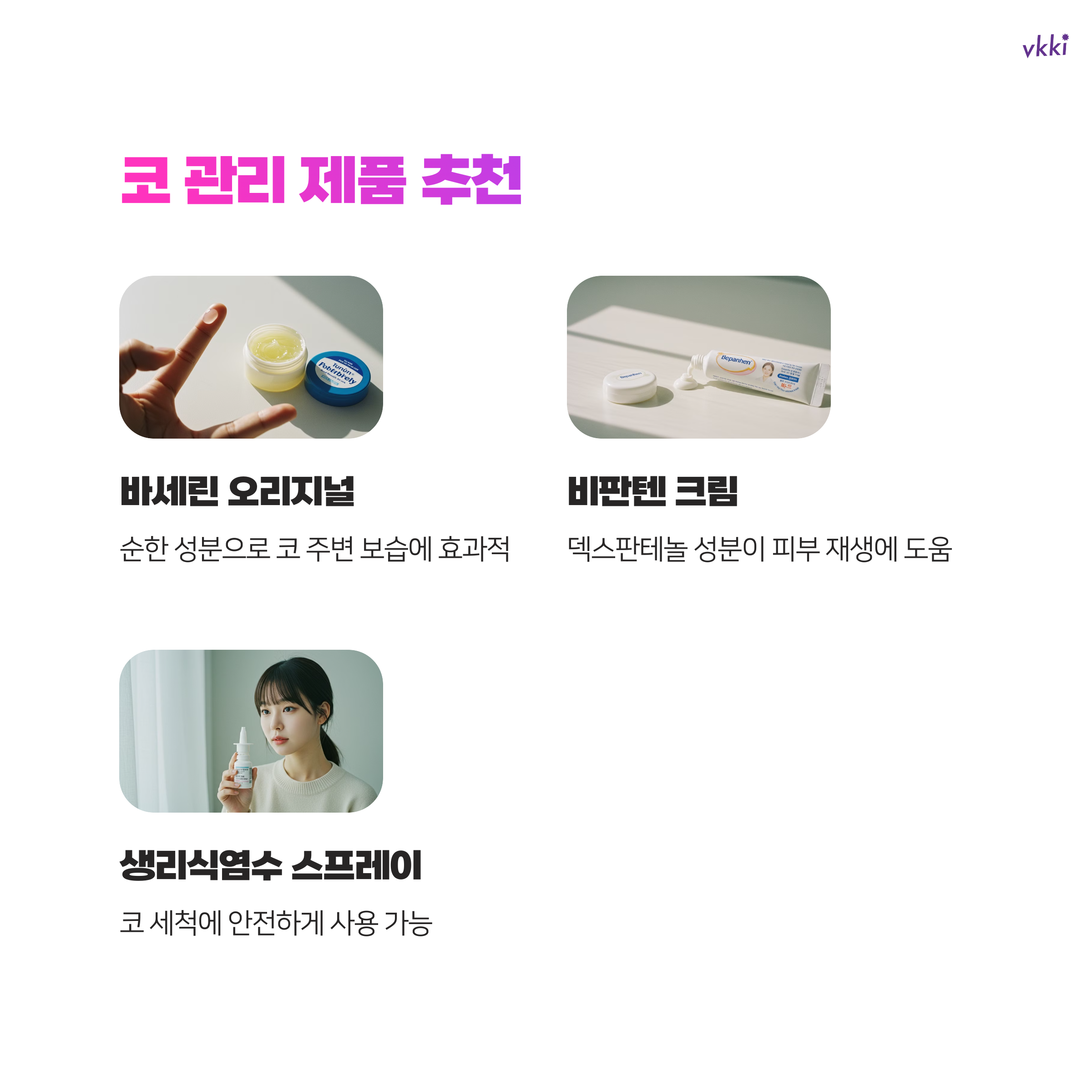 헐은 코 관리에 도움이 되는 제품들은 다양하게 있어요. 바세린 오리지널은 순한 성분으로 코 주변 보습에 효과적이며, 비판텐 크림은 덱스판테놀 성분이 함유되어 피부 진정과 재생에 도움을 줍니다. 저도 써보니까 코가 헐었을 때 발라주면 따가움이 금방 사라지더라고요.