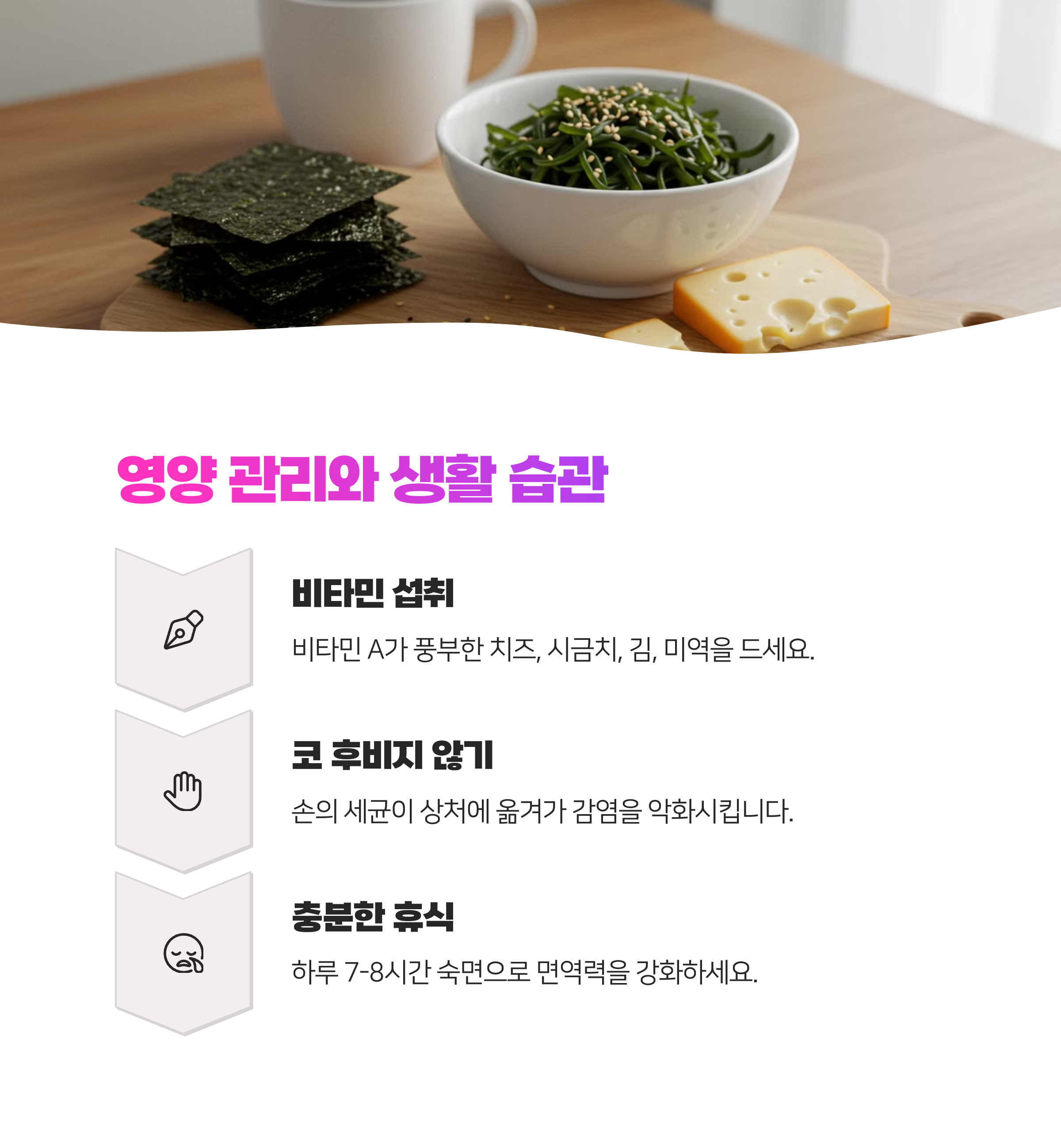 비타민은 손상된 점막 회복과 면역력 강화에 중요한 역할을 합니다. 특히 비타민 A가 풍부한 음식인 치즈, 시금치, 김, 미역, 다시마 등을 충분히 섭취하면 진피 내 수분 함량을 증가시켜 코 점막 건강에 도움이 됩니다. 다양한 비타민이 함유된 음식을 골고루 섭취하거나 필요시 영양제를 통해 보충하는 것도 좋은 방법이에요.