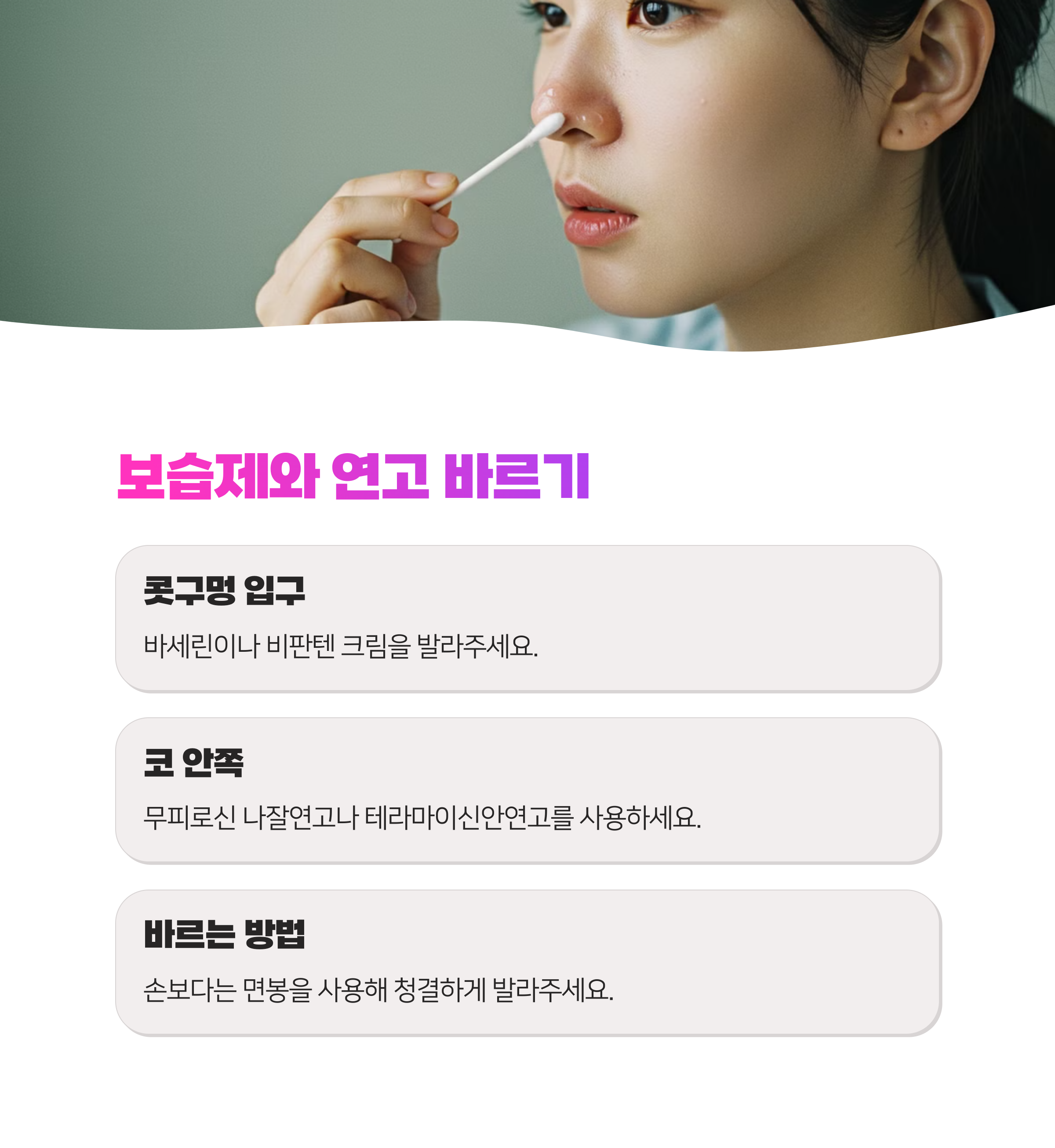 연고를 바를 때는 손보다는 면봉을 사용하여 청결하게 발라주세요. 면봉에 연고를 살짝 묻혀 코 안쪽에 얇게 발라주면 세균 감염을 예방하고 증상 완화에 도움이 됩니다.