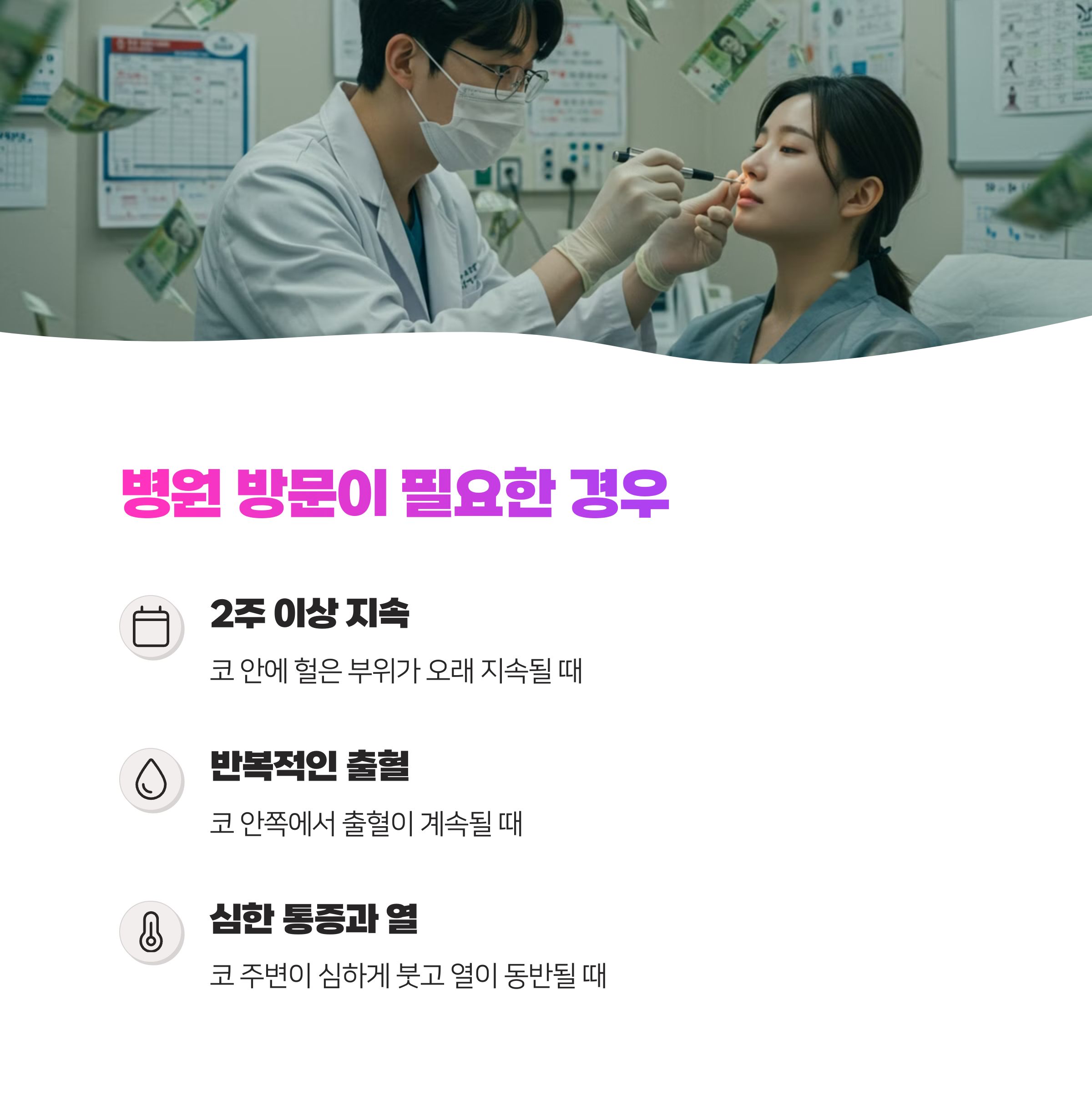 코가 헐었을 때는 최대한 코를 만지지 않는 것이 중요합니다. 손에 있는 세균이 상처 부위에 옮겨가면 감염이 악화될 수 있어요. 코를 자주 후비지 않도록 주의하고, 가려움이 있더라도 참는 것이 회복에 도움이 됩니다.