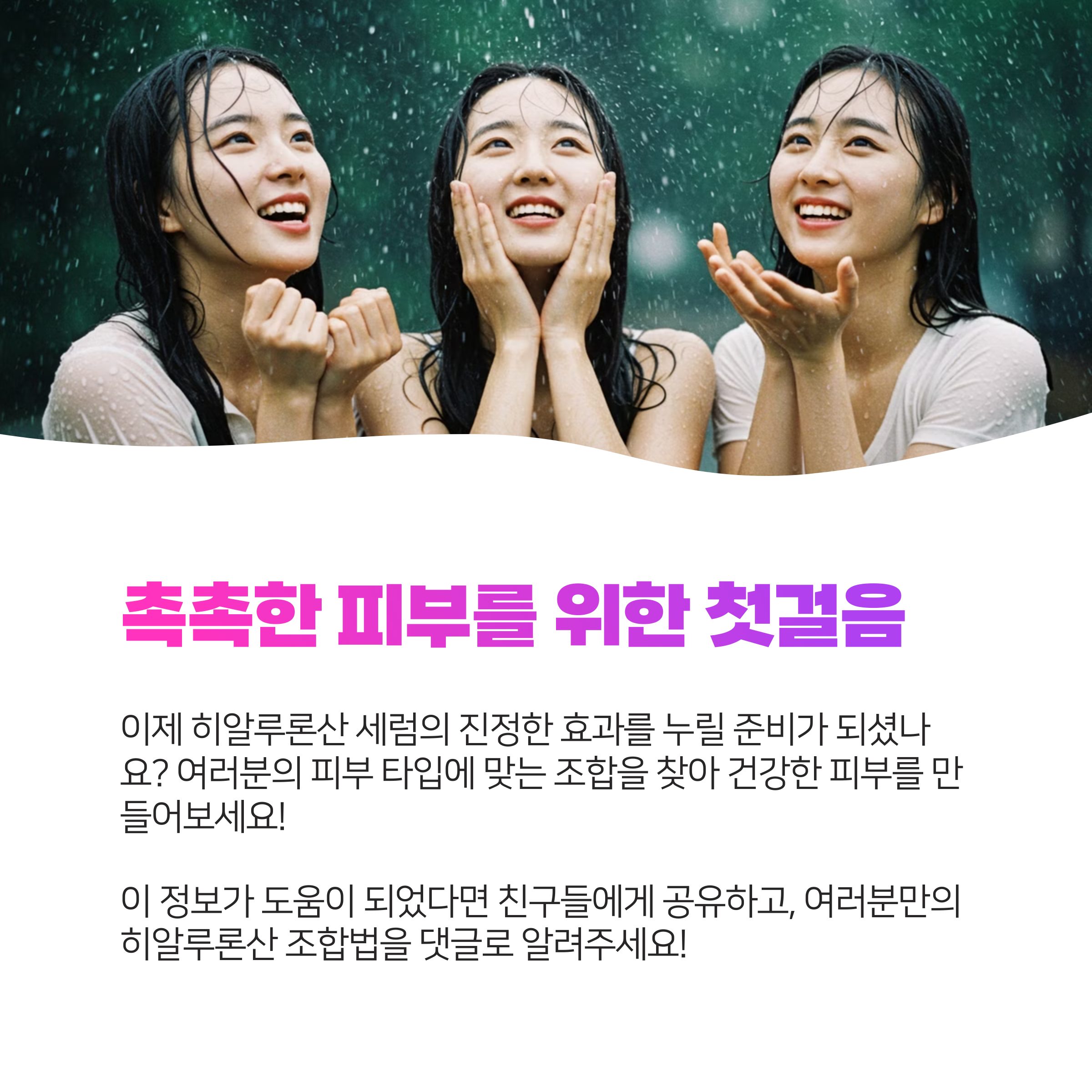 히알루론산 세럼은 올바른 사용법과 적절한 성분 조합을 통해 그 효과를 극대화할 수 있습니다. 이제 여러분도 이 글에서 배운 조합법을 활용하여 더 촉촉하고 건강한 피부를 가꿔보세요. 피부 타입에 맞는 조합을 찾아 꾸준히 사용한다면, 놀라운 변화를 경험하실 수 있을 거예요!