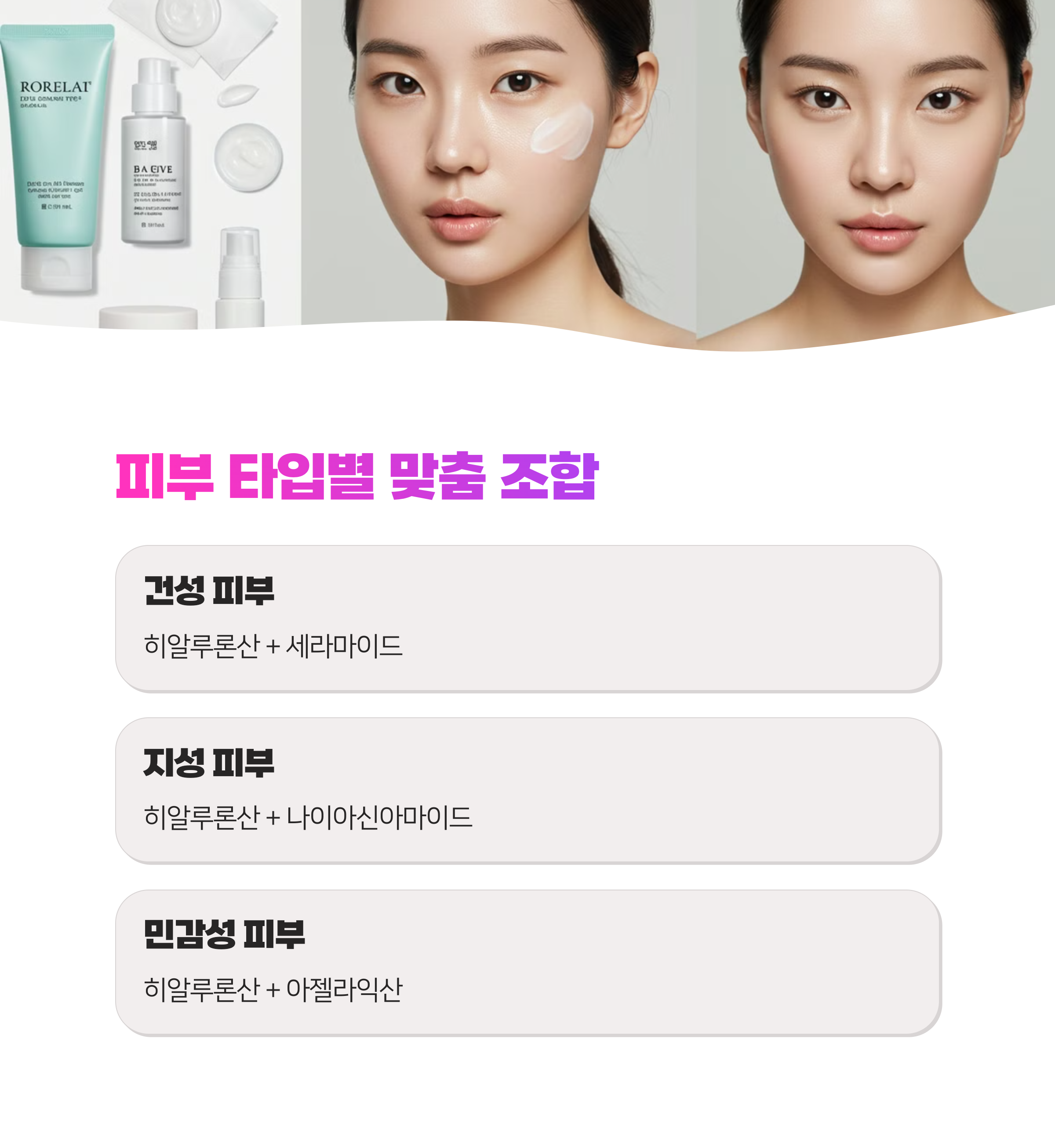 건성 피부는 히알루론산과 세라마이드의 조합이 특히 효과적입니다. 이 조합은 피부 장벽을 강화하고 수분을 오래 유지하는 데 도움이 됩니다.