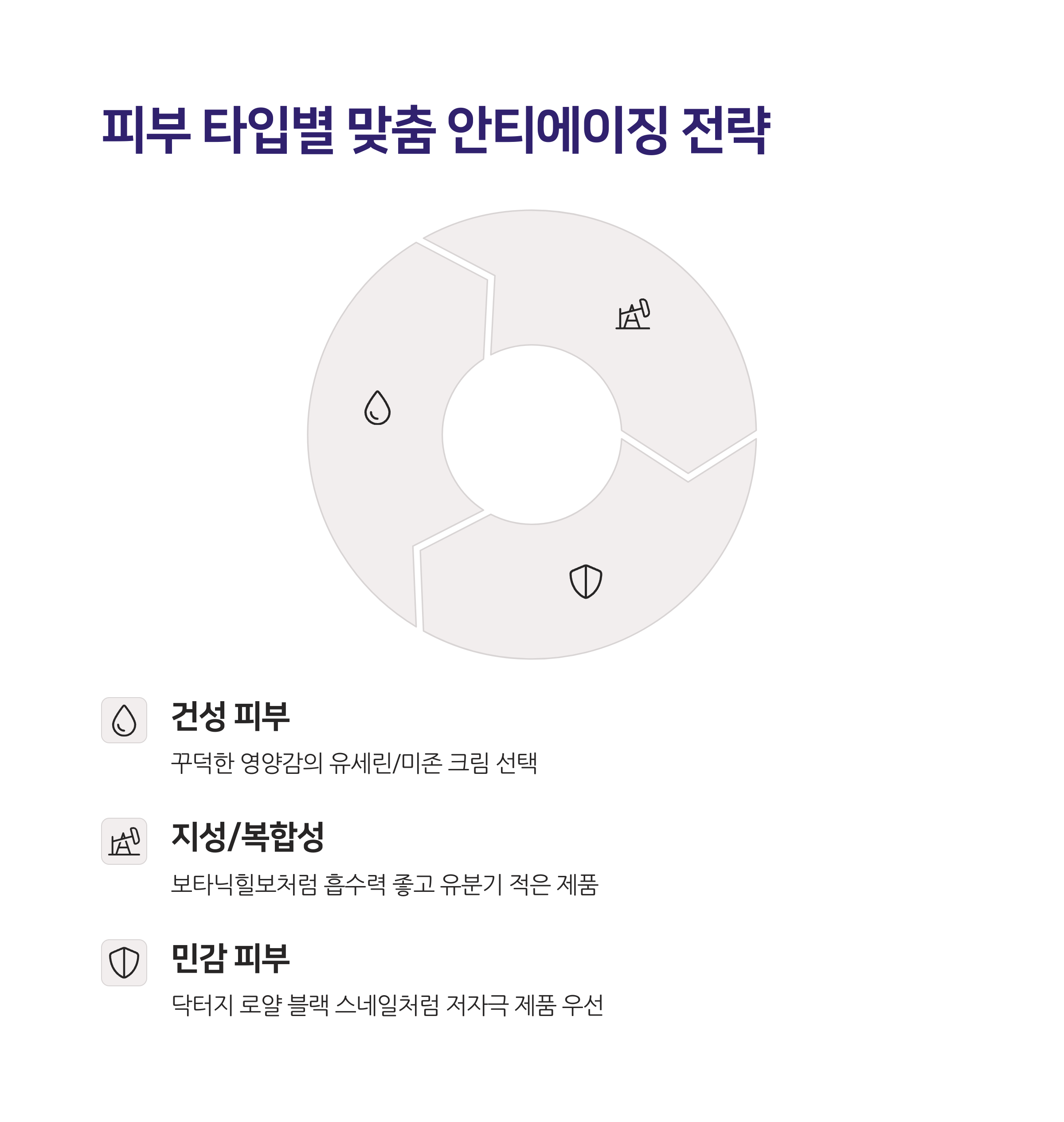 건성 피부는 수분과 유분이 부족해 더 빠른 노화가 진행돼요. 유세린 하이알루론 3X 나이트크림이나 미즈온 콜라겐 파워 리프팅 크림처럼 풍부한 보습과 영양을 제공하는 제품을 선택하세요! 에센스-세럼-크림 순으로 레이어링하면 효과가 더 좋아요.